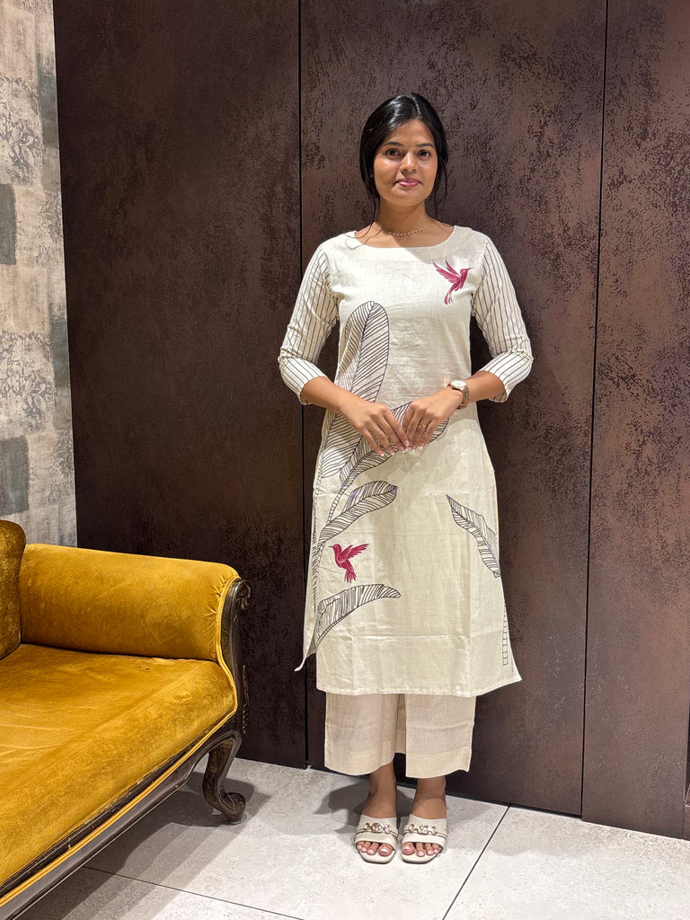 Beige Zardosi Printed Crape Kurti Set with Dupatta