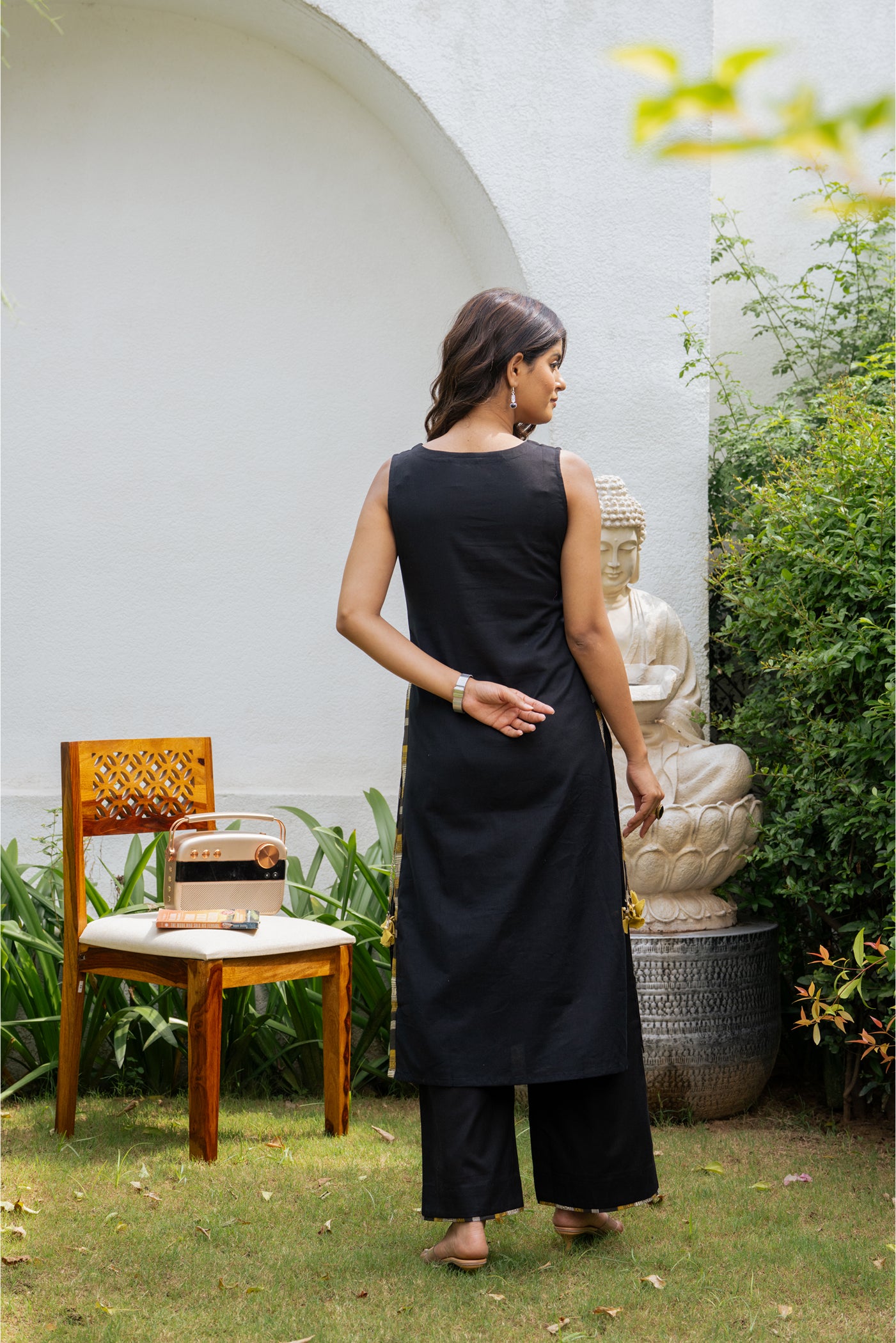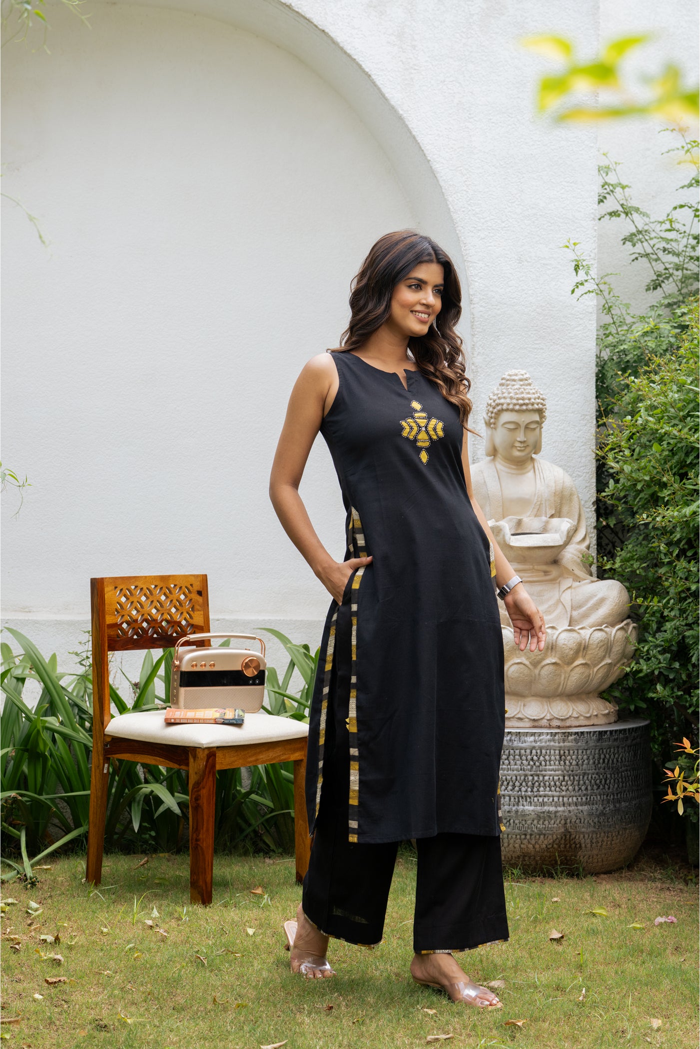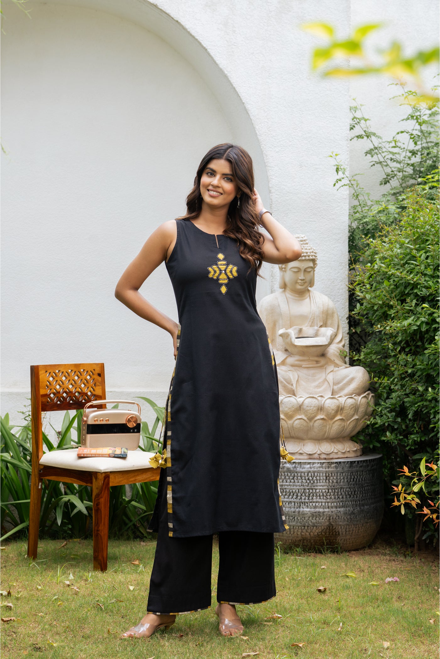 - Keep it classic with this black cotton kurti set, designed for effortless comfort and style. Paired with matching pants and a dupatta, its breathable fabric makes it perfect for office wear, casual outings, or relaxed festive gatherings.