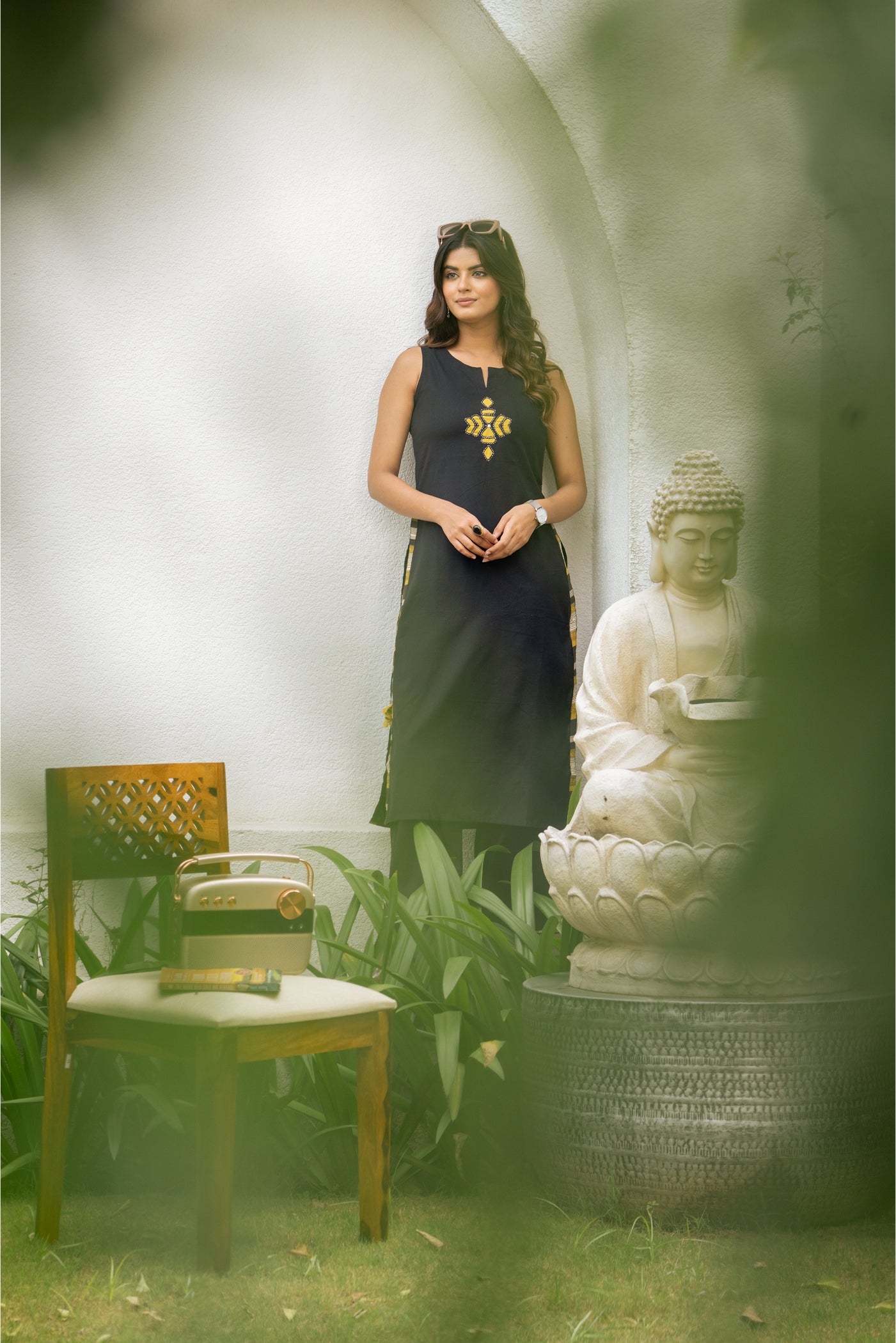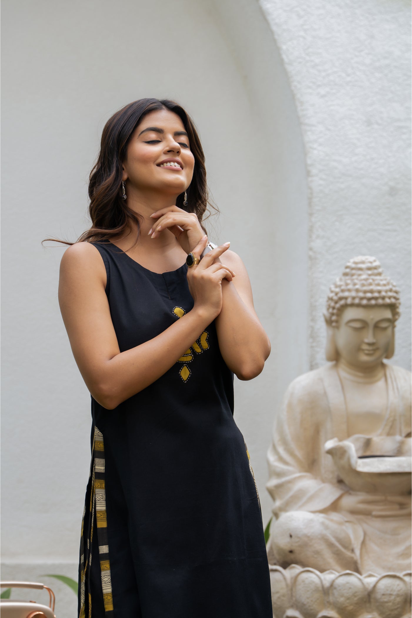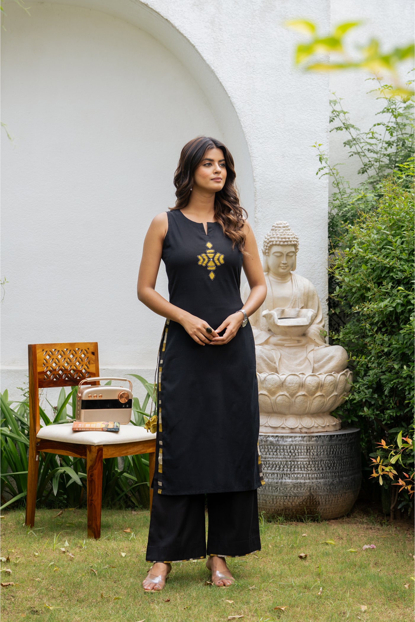 - Keep it classic with this black cotton kurti set, designed for effortless comfort and style. Paired with matching pants and a dupatta, its breathable fabric makes it perfect for office wear, casual outings, or relaxed festive gatherings.