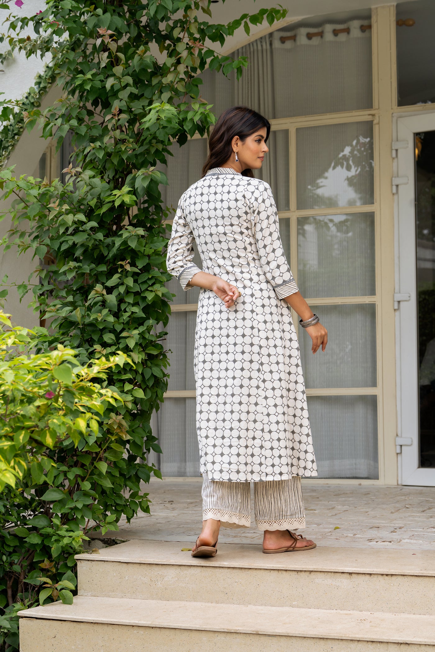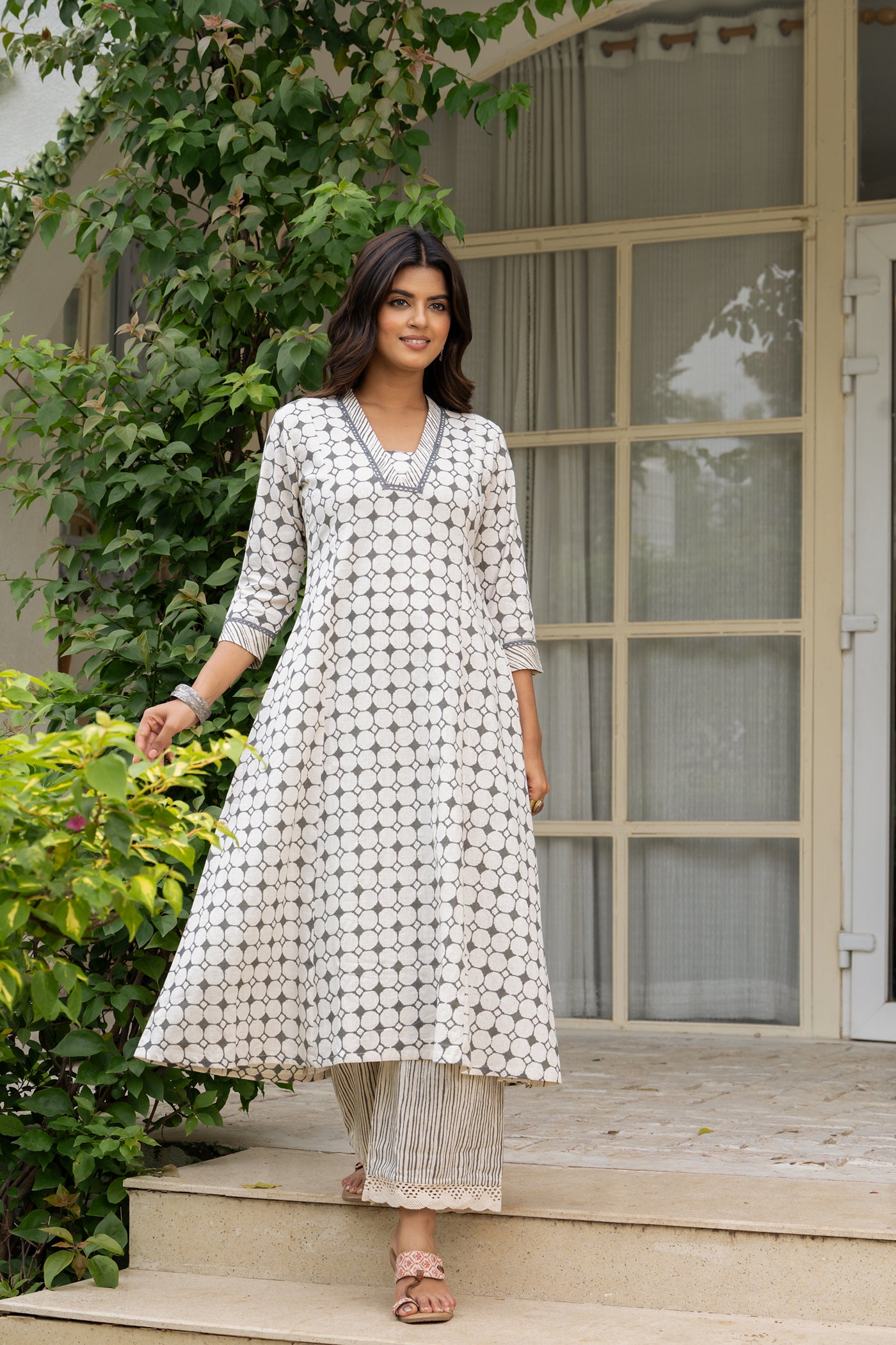 - Keep it effortlessly stylish with this grey printed cotton kurti set, paired with matching pants and a soft dupatta. Crafted from breathable fabric, it’s perfect for work, casual brunches, or laid-back festive gatherings.