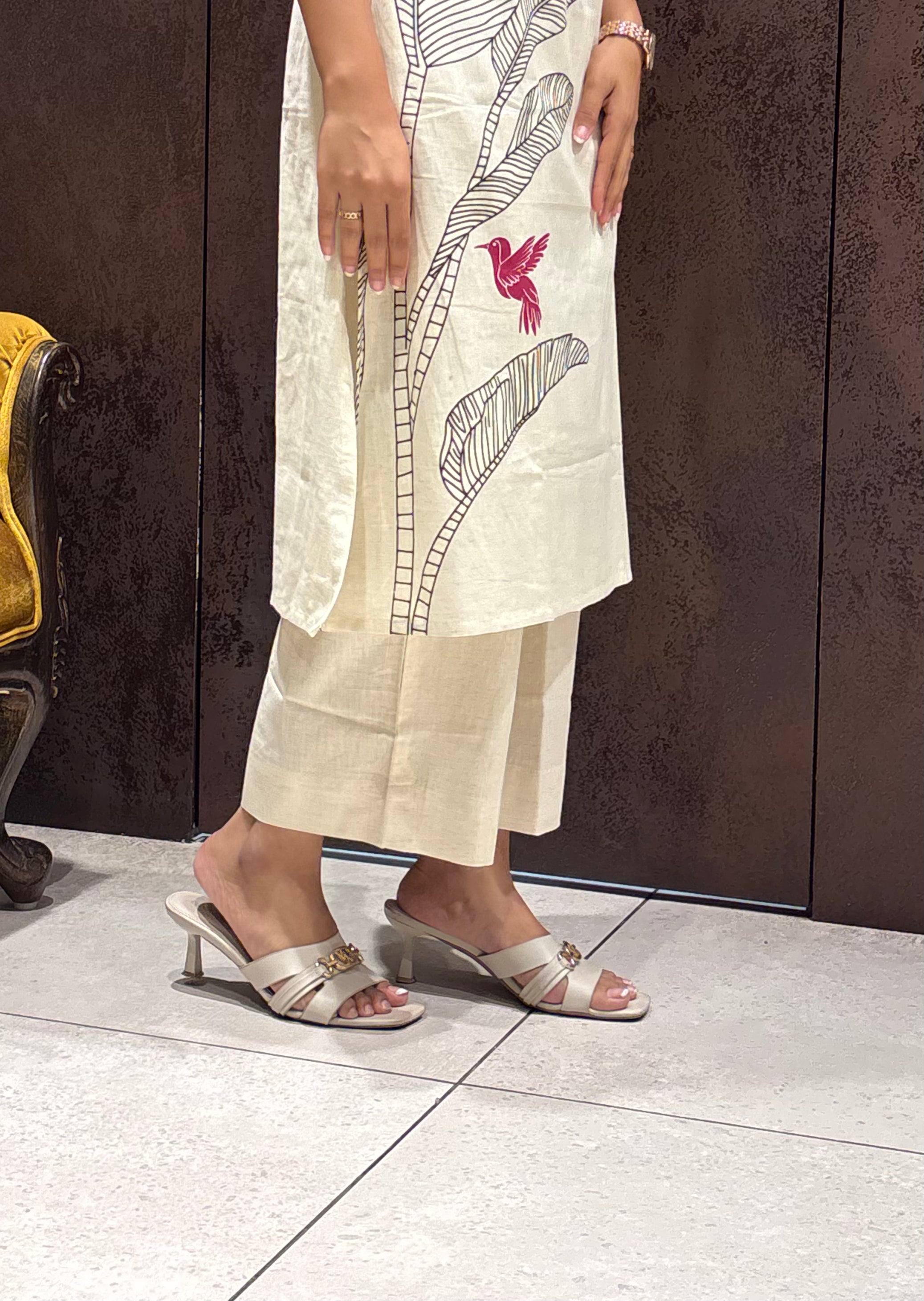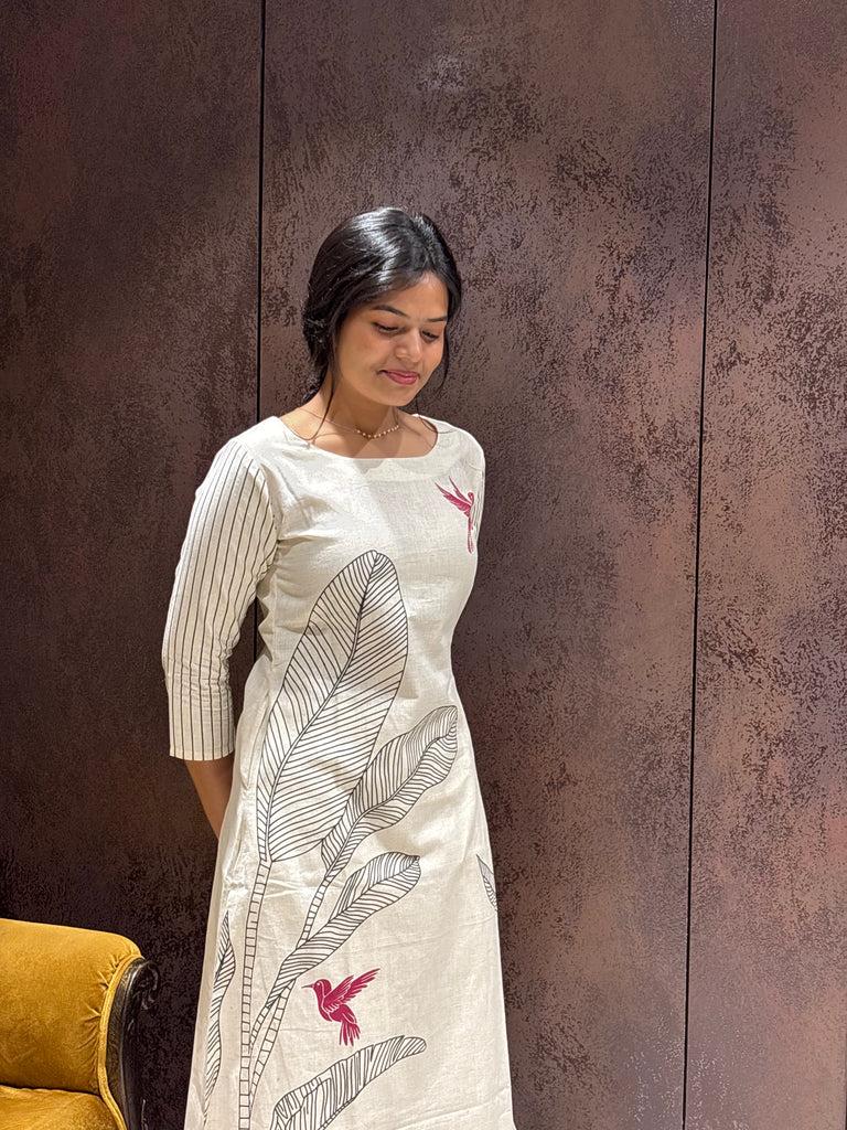 Our off-white cotton kurti set features delicate bird prints that add a soft, charming touch. Perfect for work, brunch, and everyday comfort. Pair it with your favourite accessories for a chic, minimal look that never goes out of style!