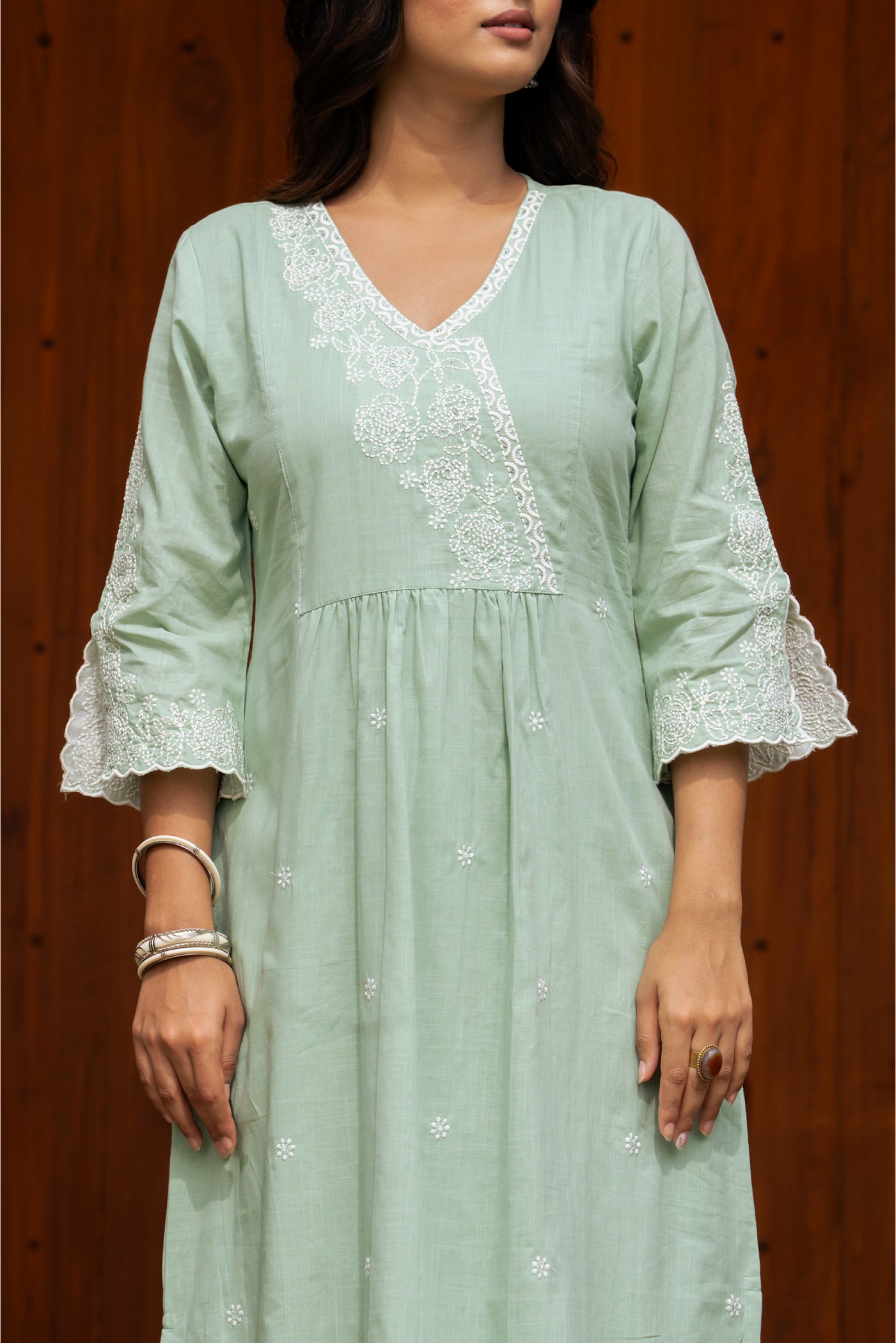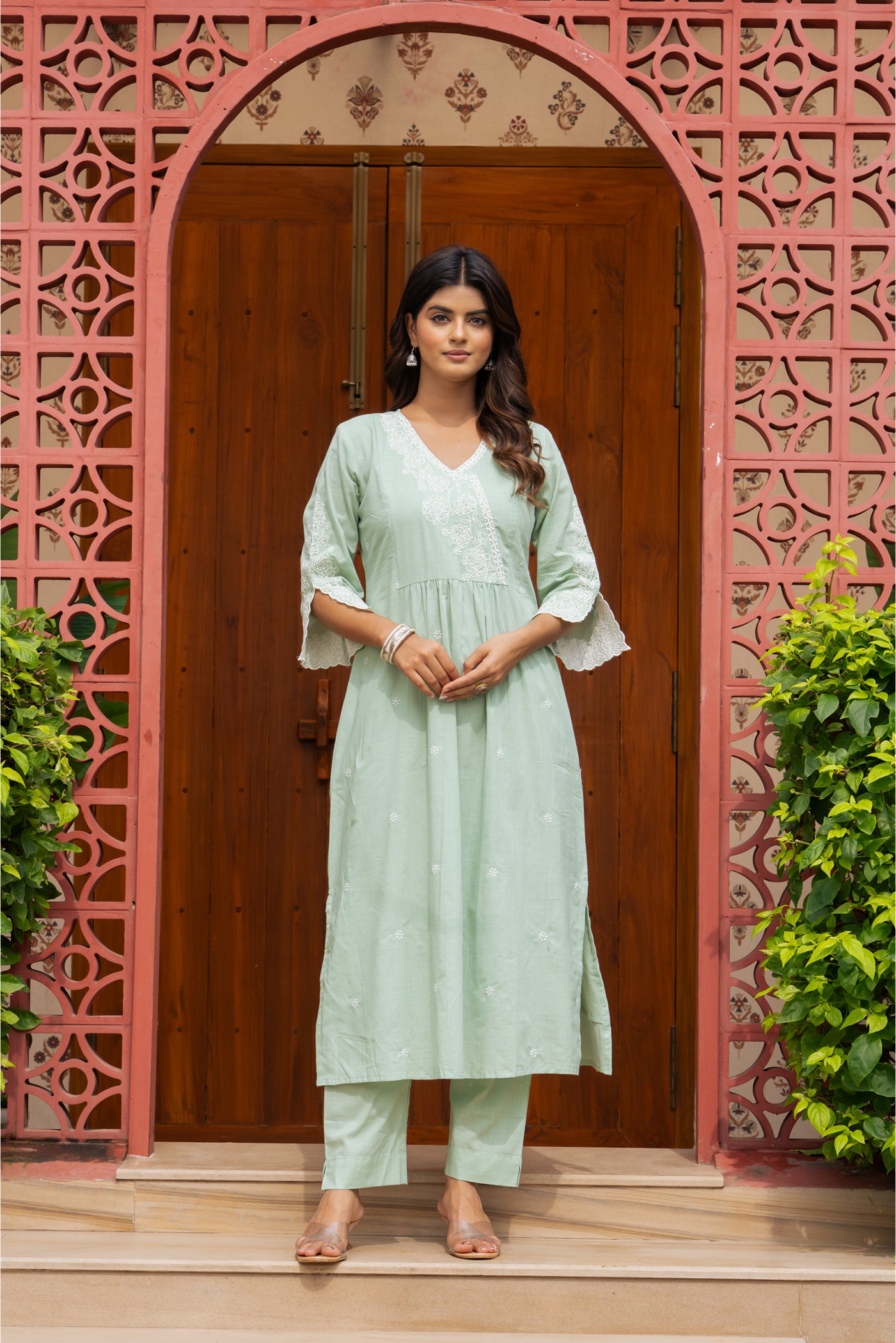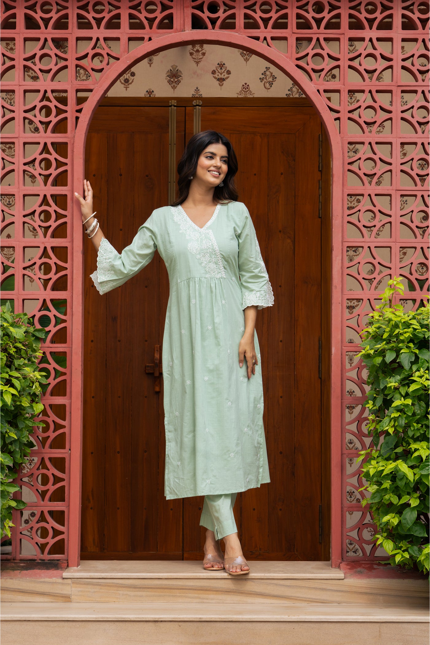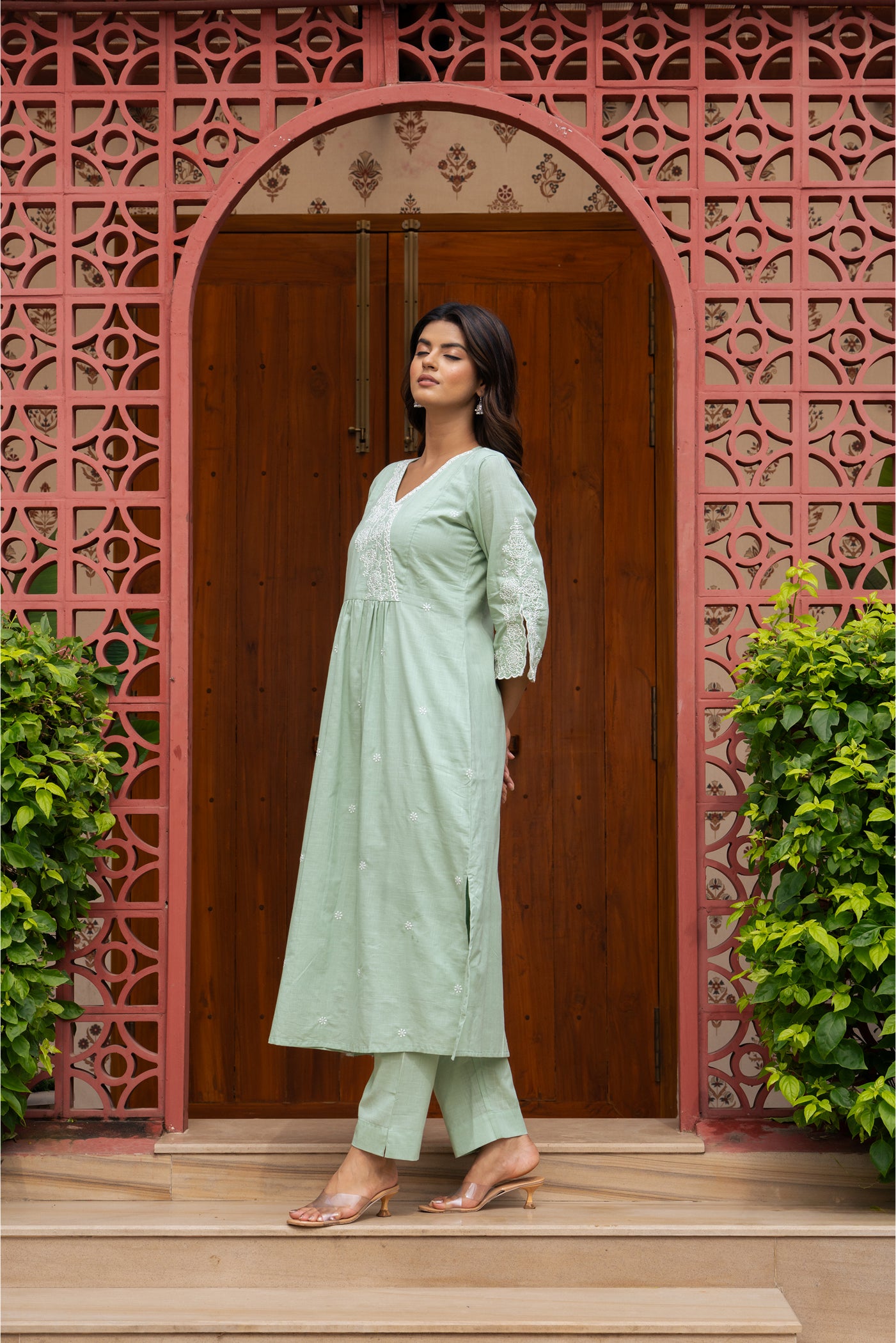 Pista Green V-Neck Cotton Emboridered Kurti Set