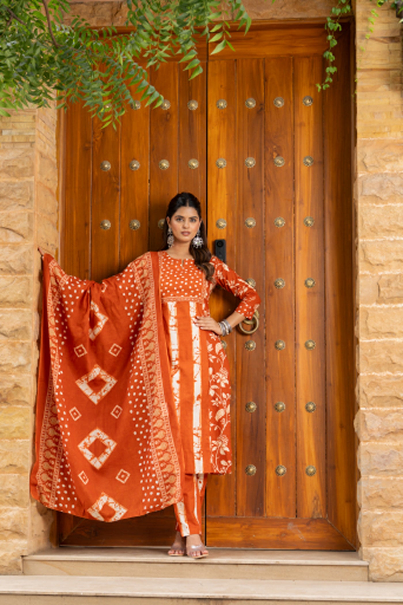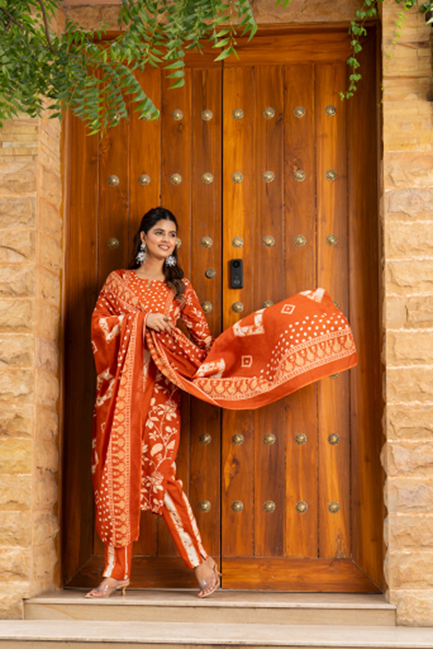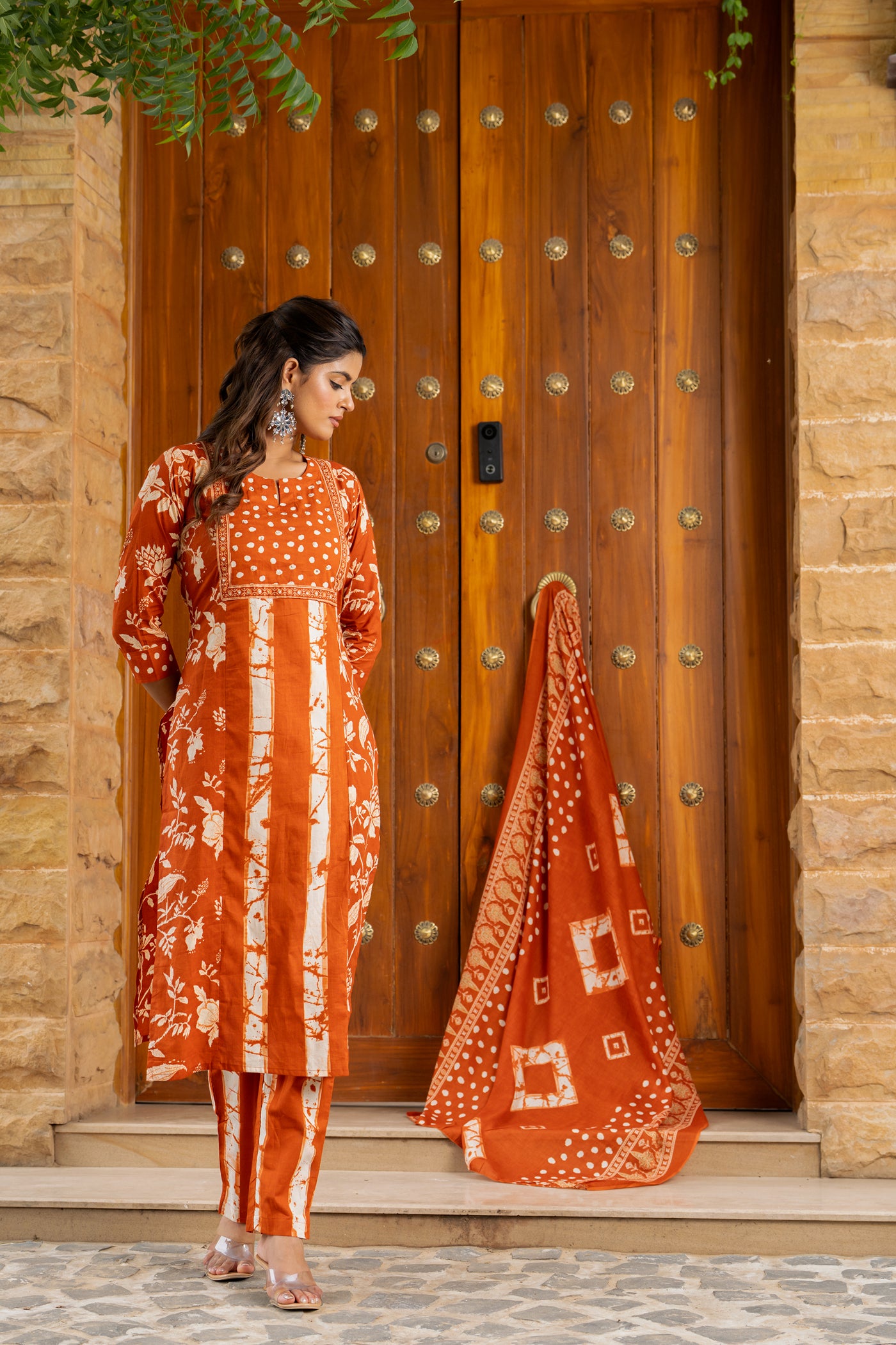 - Brighten your day in this orange printed cotton kurti set with pants and dupatta. Crafted from soft, breathable fabric, it blends comfort and elegance — perfect for office hours, casual brunches, or festive get-togethers.