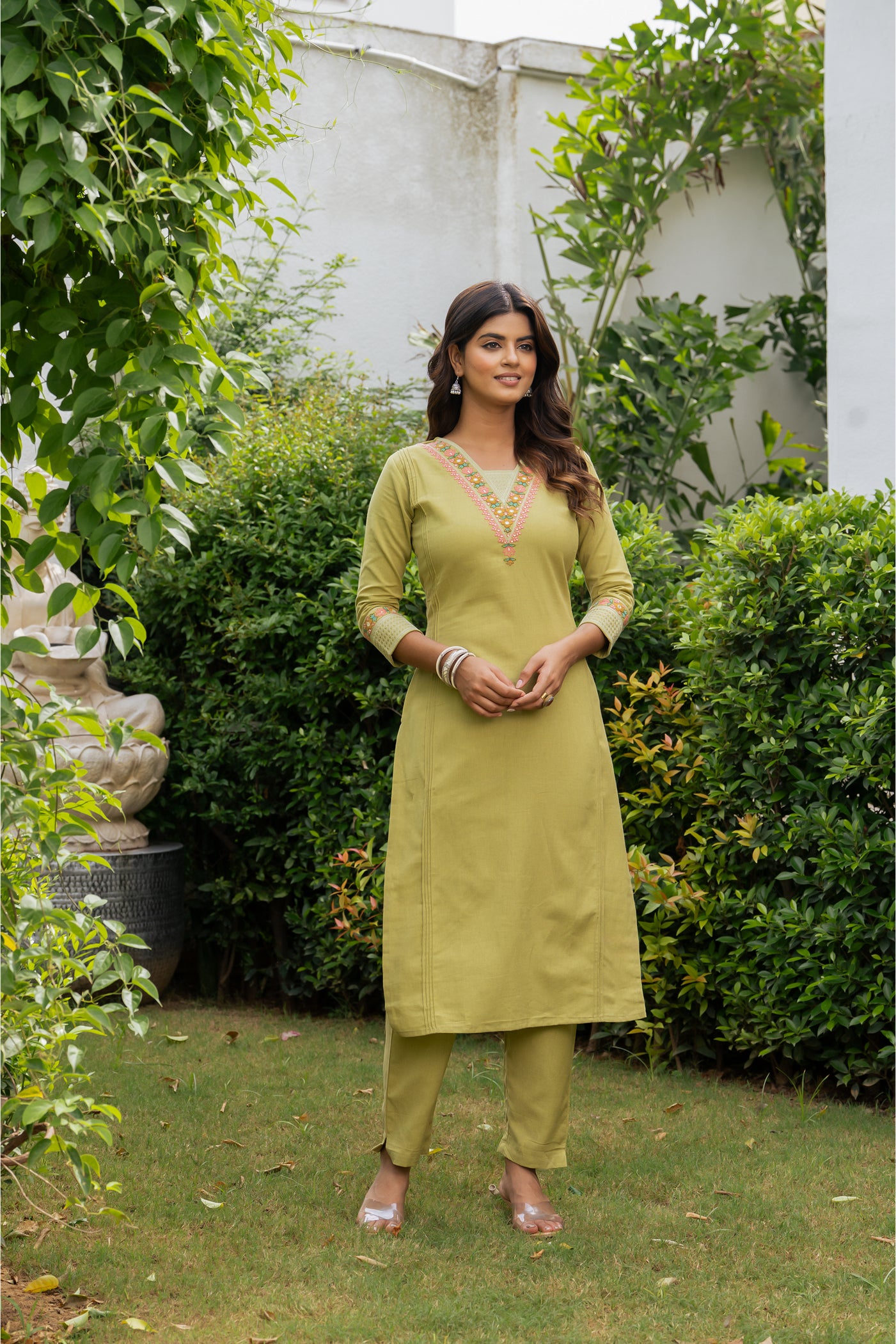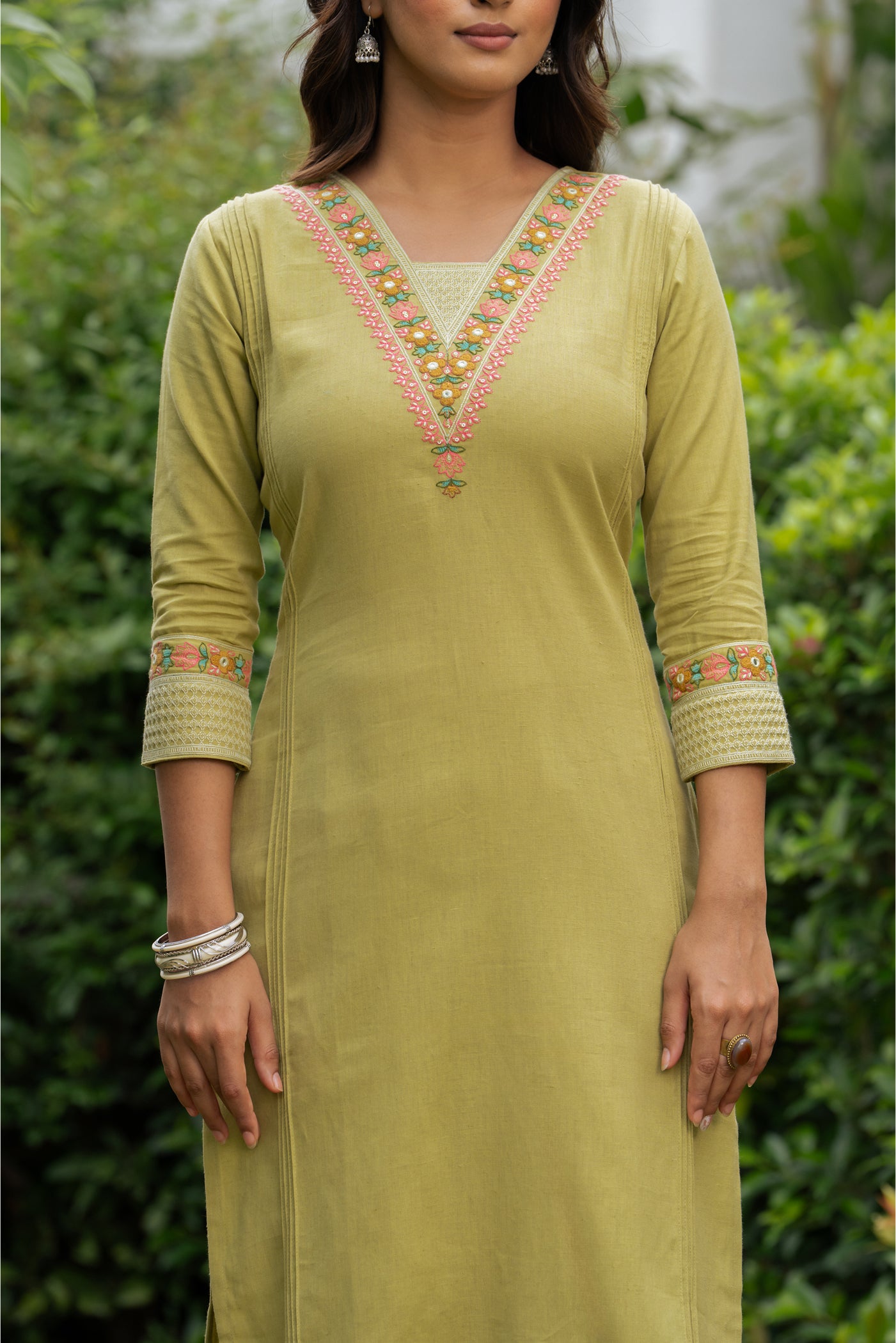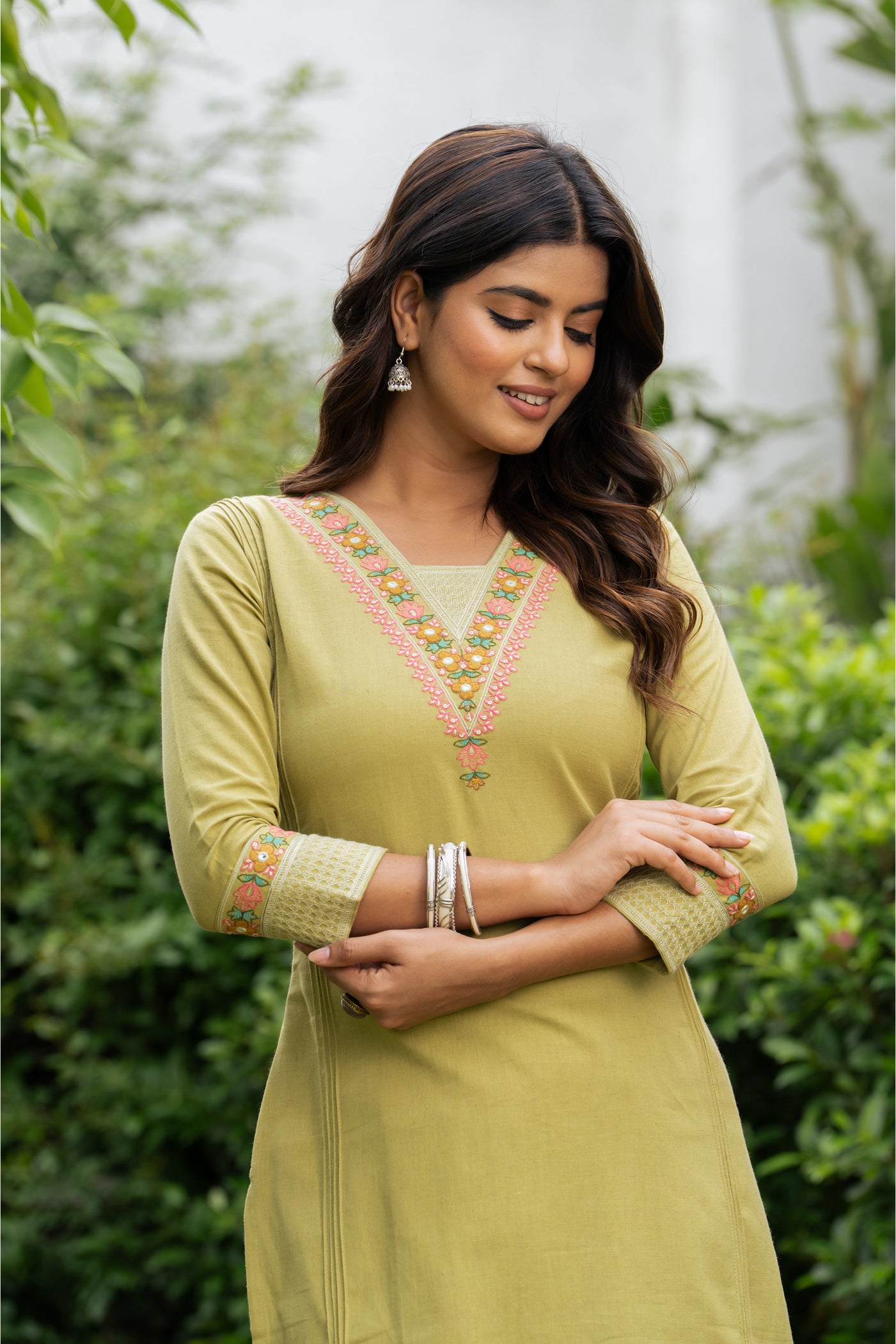 - Stay effortlessly graceful in this pista green cotton kurti set, adorned with fine embroidery. Complete with matching pants and dupatta, it’s a breathable, versatile choice for office hours, casual brunches, or light festive occasions.
