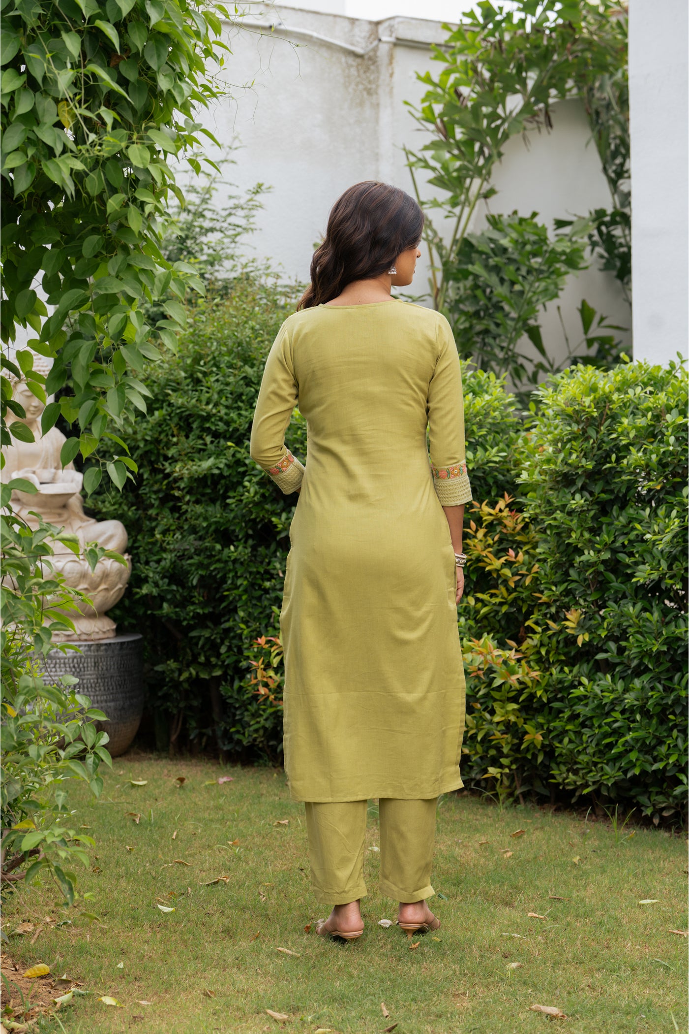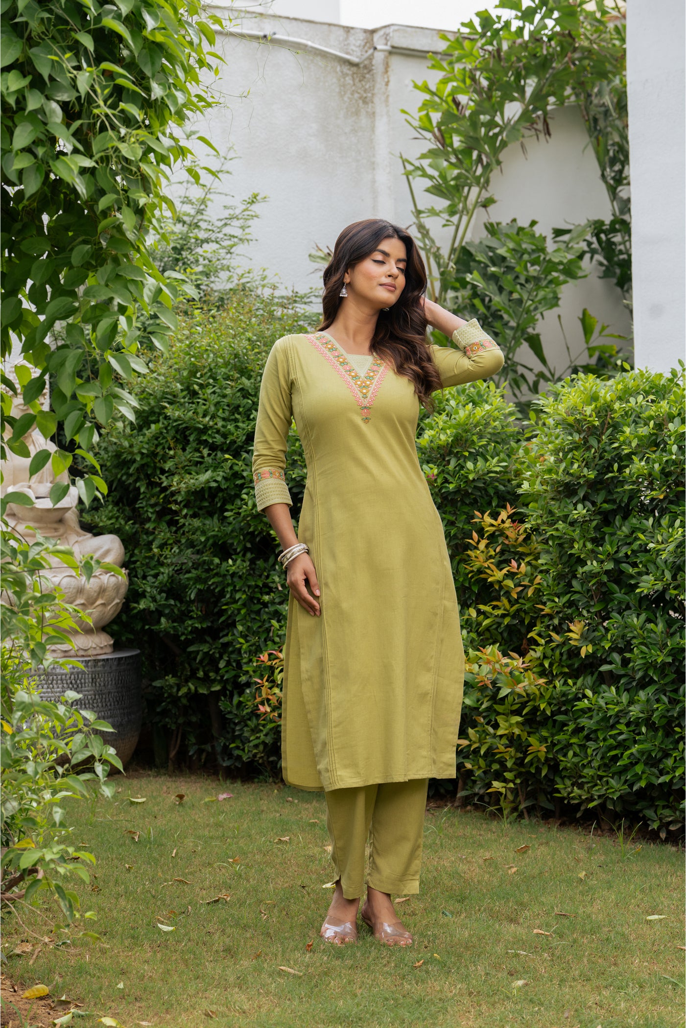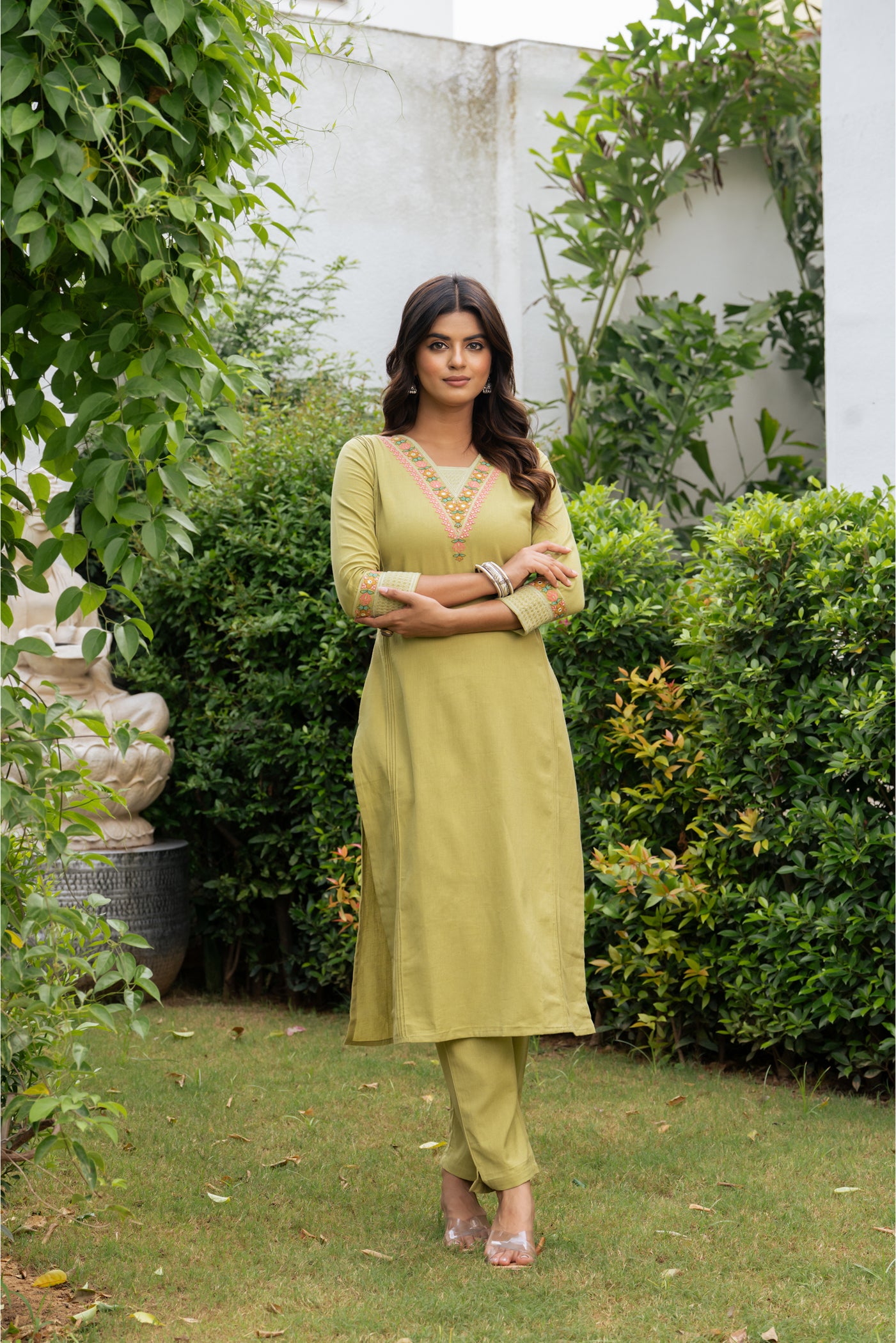- Stay effortlessly graceful in this pista green cotton kurti set, adorned with fine embroidery. Complete with matching pants and dupatta, it’s a breathable, versatile choice for office hours, casual brunches, or light festive occasions.