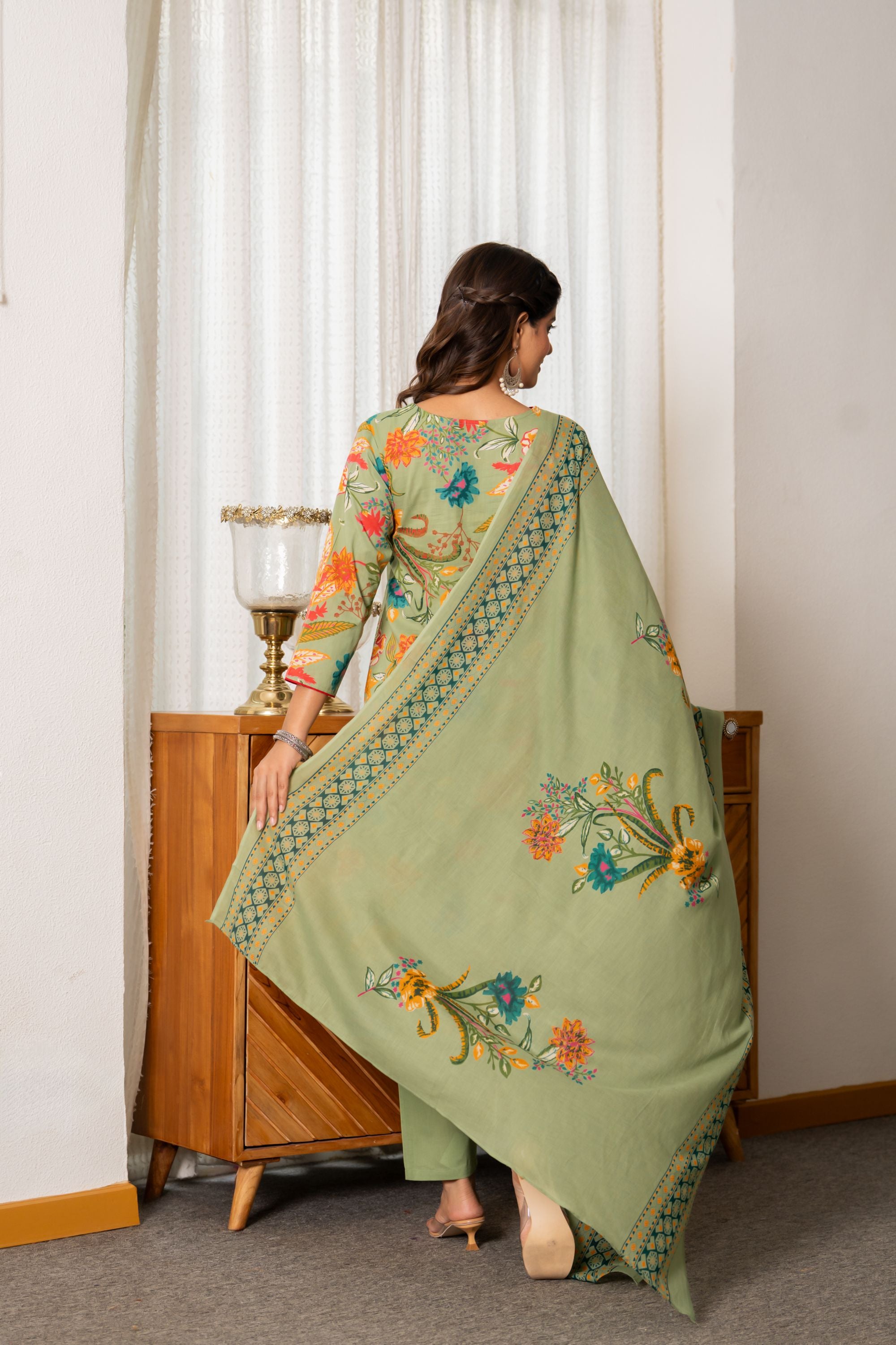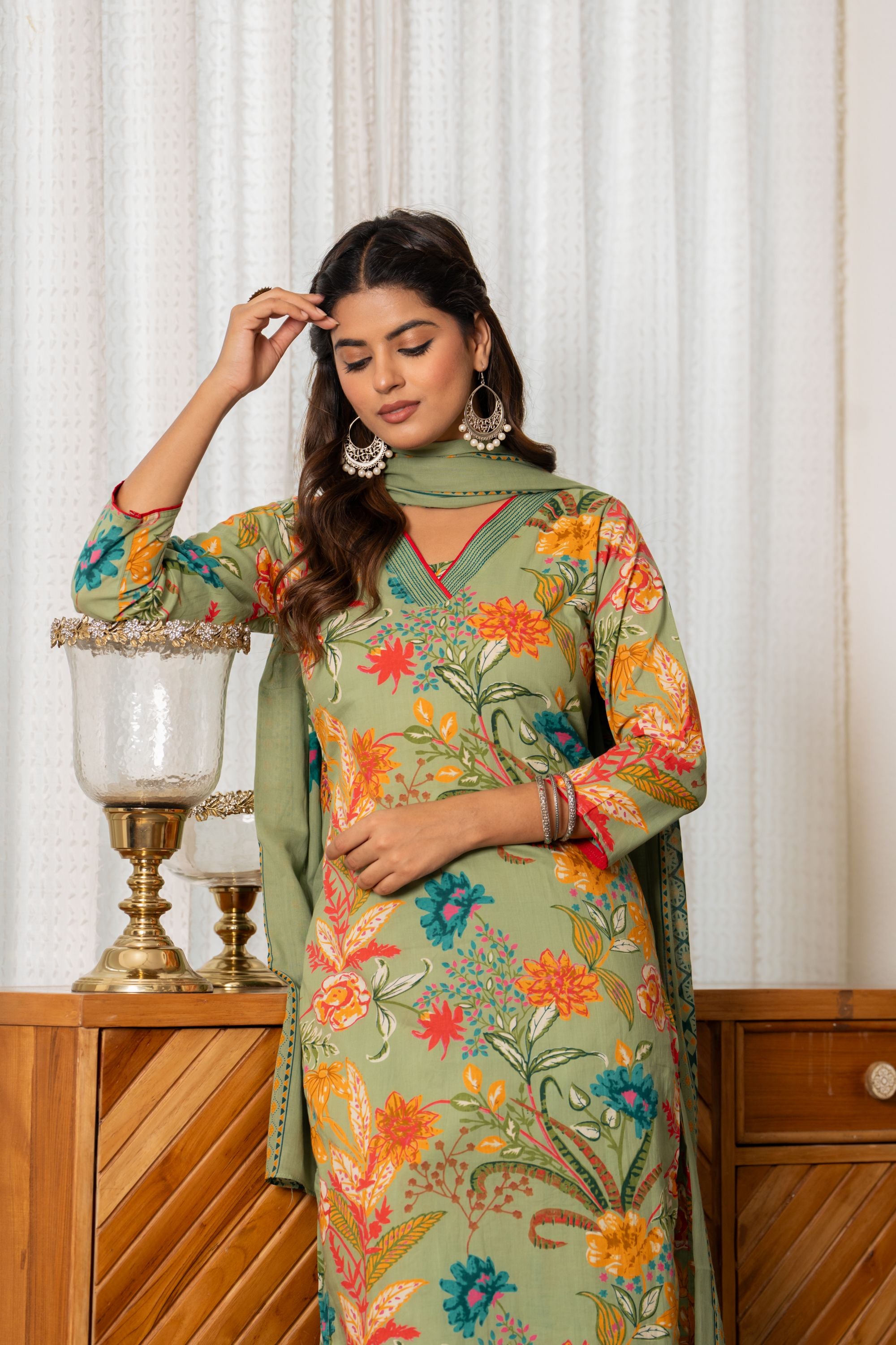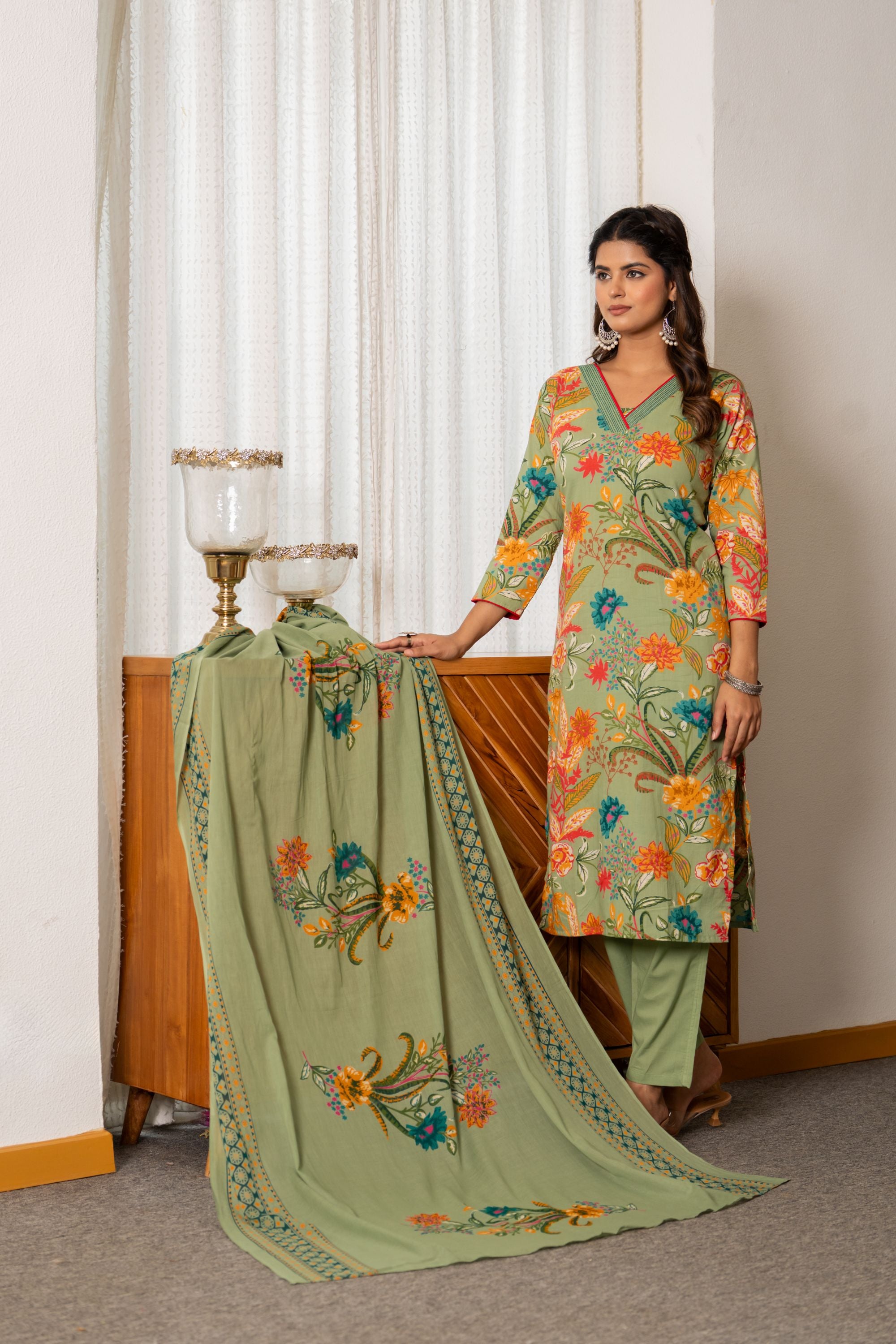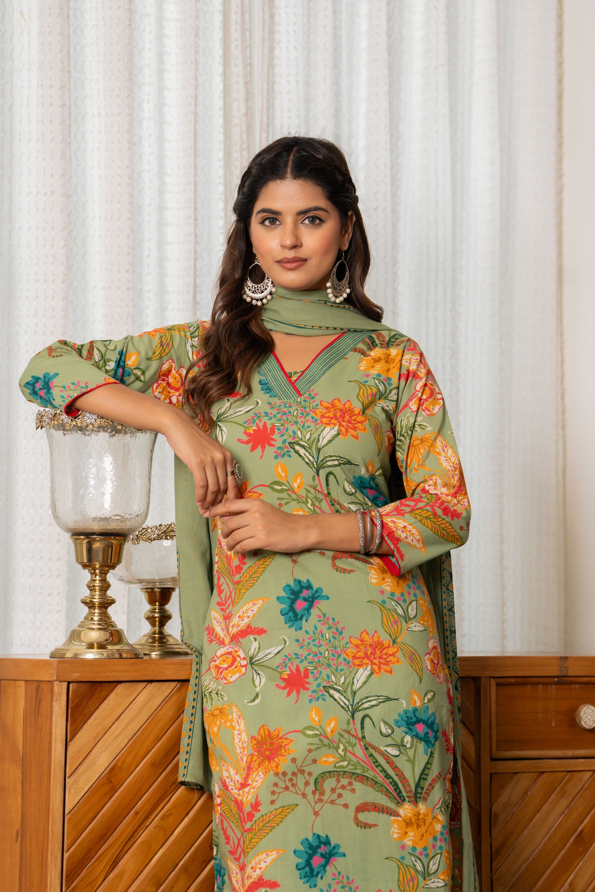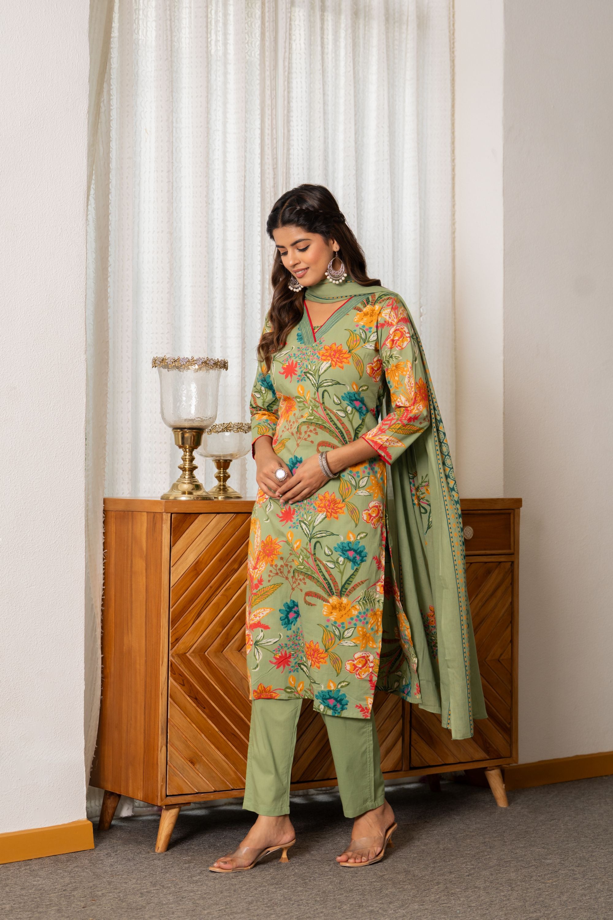 Pista Green Printed V-Neck Kurti Set with Dupatta