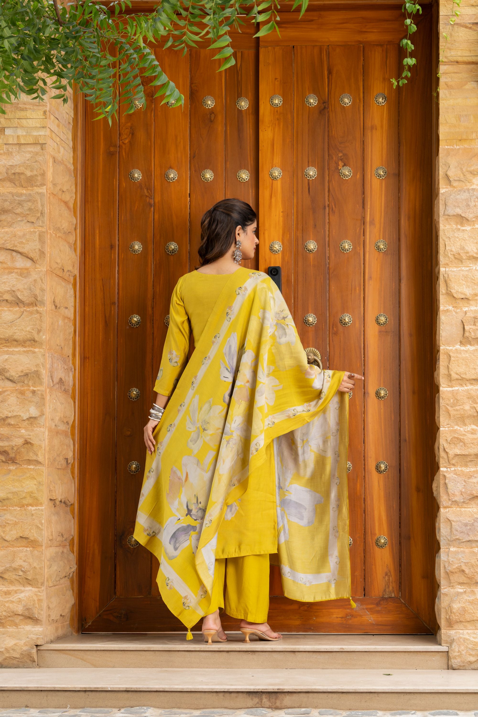 Muslin Embroidered Mustard Printed Kurti Set with Dupatta