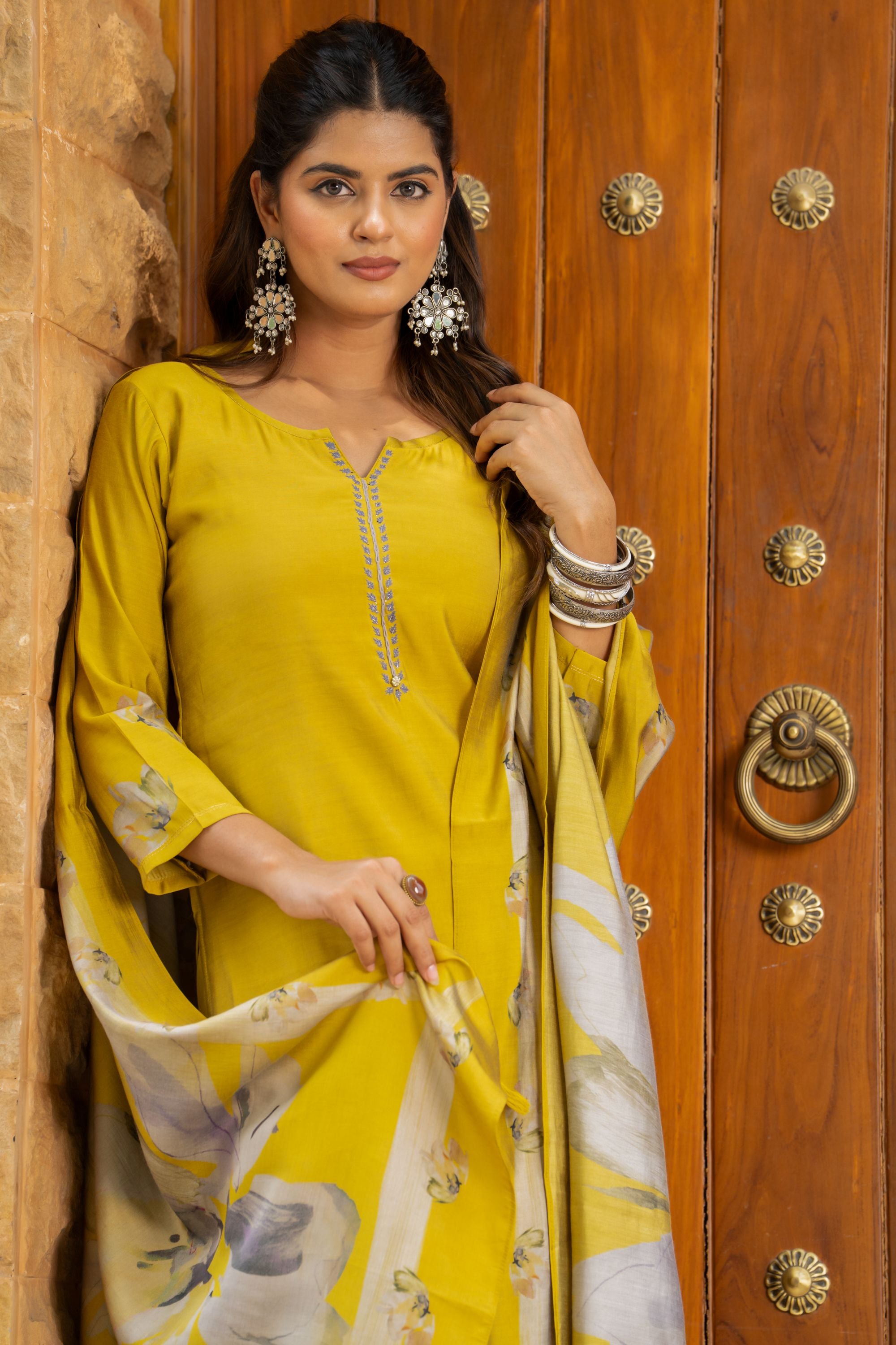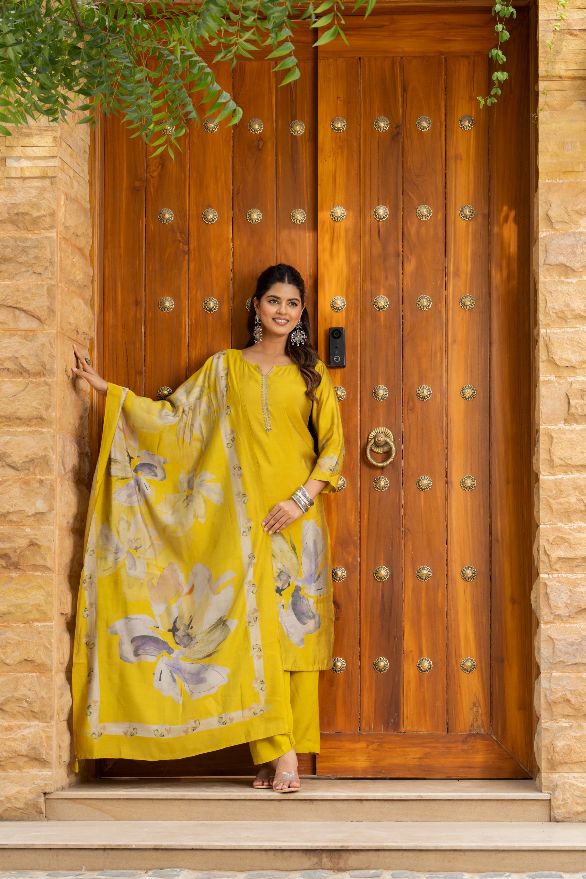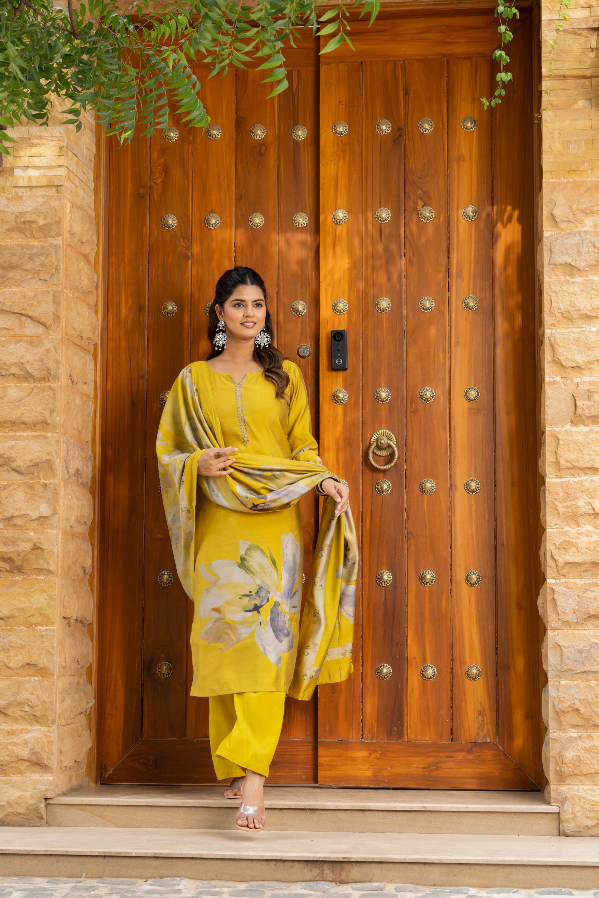 Step into effortless elegance with this muslin embroidered mustard printed kurti set with dupatta. Crafted from soft, flowy muslin with graceful prints and delicate embroidery, it offers comfort with a refined look—perfect for office wear, festive days, and casual gatherings.